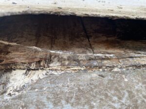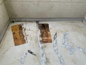 この状態の下地では、しっかりとした防水層を作る事が難しいと考え、合板を張ってからその上にQVシートでの通気緩衝工法(ウレタン防水)で防水層を作るリフォームをご提案させていただきました。